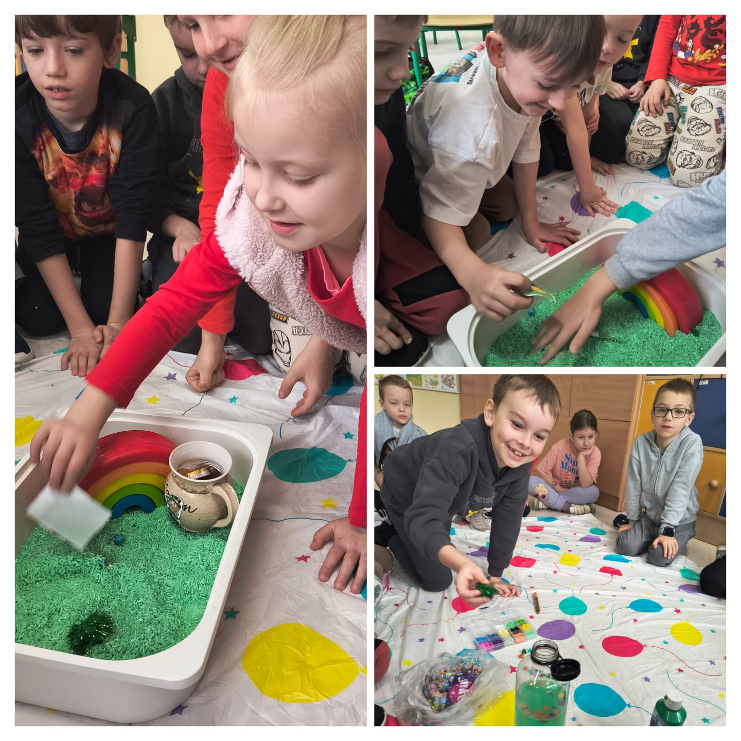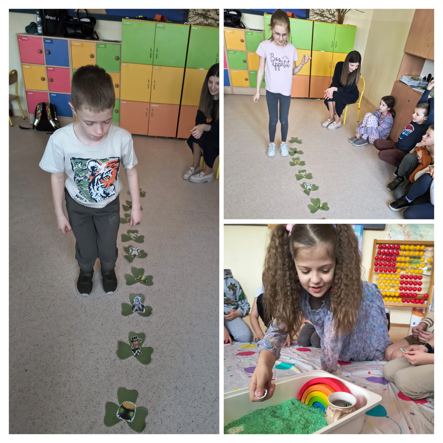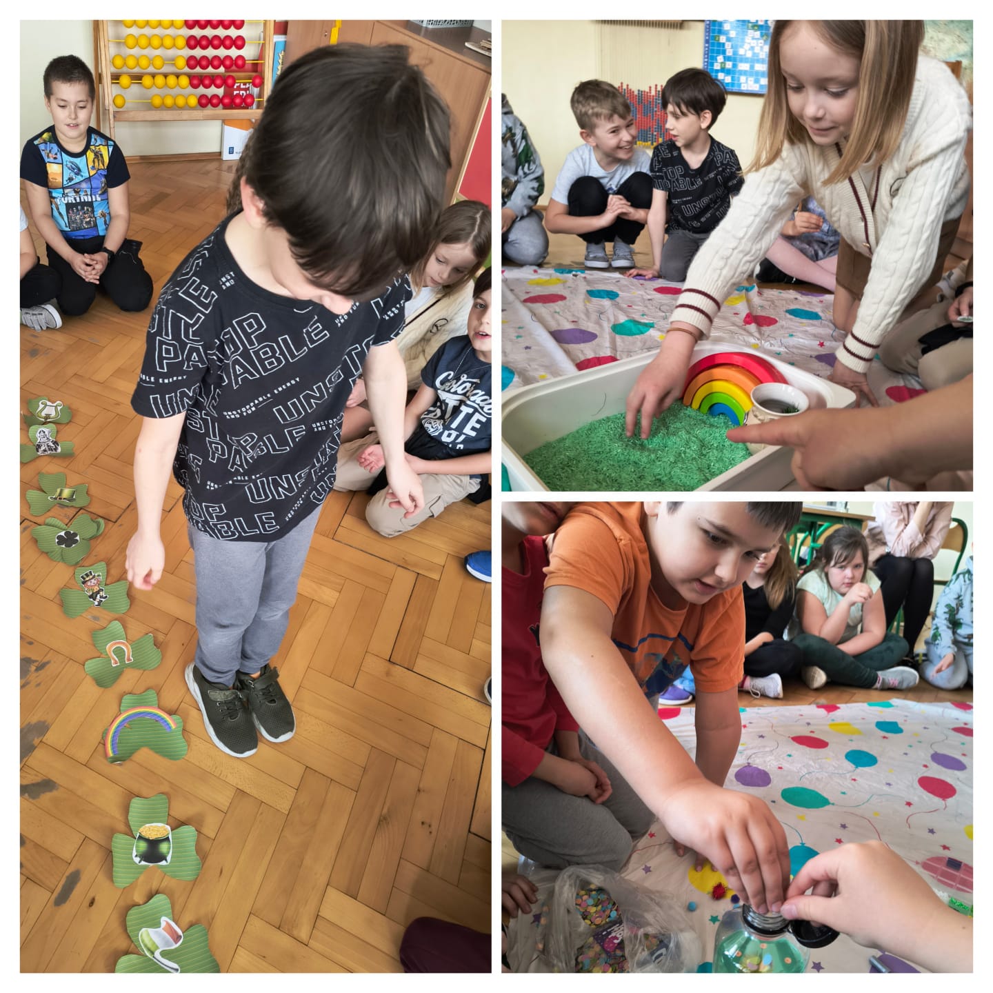 W klasach pierwszych i drugich dzieci utrwalały nowe wyrażenia przy pomocy zabaw ruchowych i sensorycznych. Uczniowie skakali po obrazkach, nazywając je. Następnie szukali ilustracji ukrytych w „trawie pod tęczą” (zielonym ryżu), a potem stworzyli wspólnie zielone butelki sensoryczne, poznając przy tym nazwy artykułów plastycznych w języku angielskim. Pod koniec zajęć dzieci odnalazły skarb schowany przez Leprechauna- garniec złotych monet, którymi skrzat się z nimi podzielił. W klasie trzeciej uczniowie wykonali lapbooki związane z Dniem Świętego Patryka.