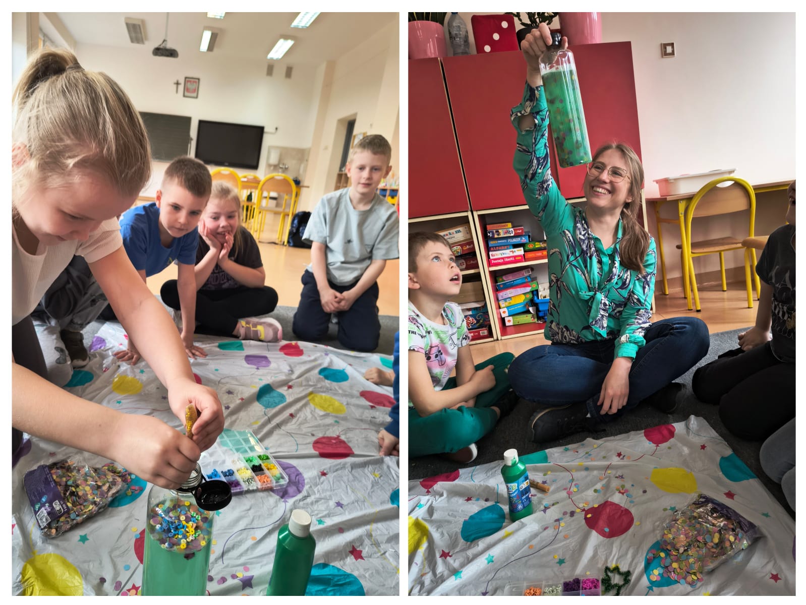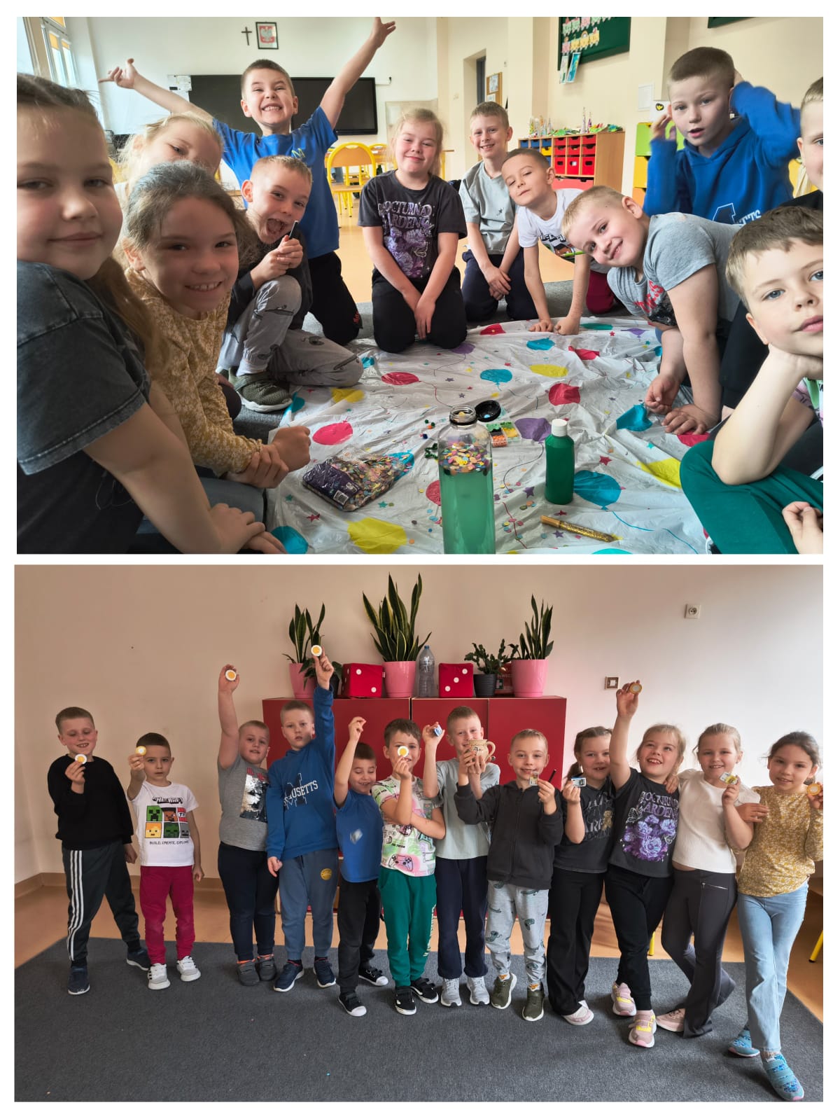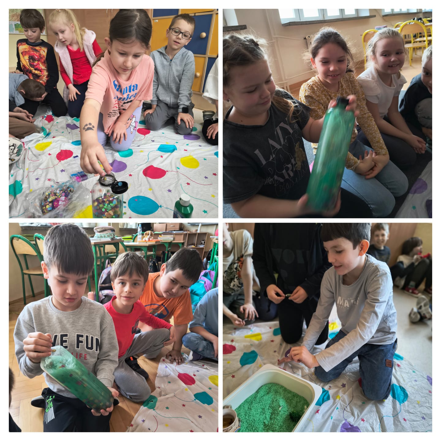 W klasach pierwszych i drugich dzieci utrwalały nowe wyrażenia przy pomocy zabaw ruchowych i sensorycznych. Uczniowie skakali po obrazkach, nazywając je. Następnie szukali ilustracji ukrytych w „trawie pod tęczą” (zielonym ryżu), a potem stworzyli wspólnie zielone butelki sensoryczne, poznając przy tym nazwy artykułów plastycznych w języku angielskim. Pod koniec zajęć dzieci odnalazły skarb schowany przez Leprechauna- garniec złotych monet, którymi skrzat się z nimi podzielił. W klasie trzeciej uczniowie wykonali lapbooki związane z Dniem Świętego Patryka.