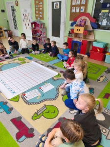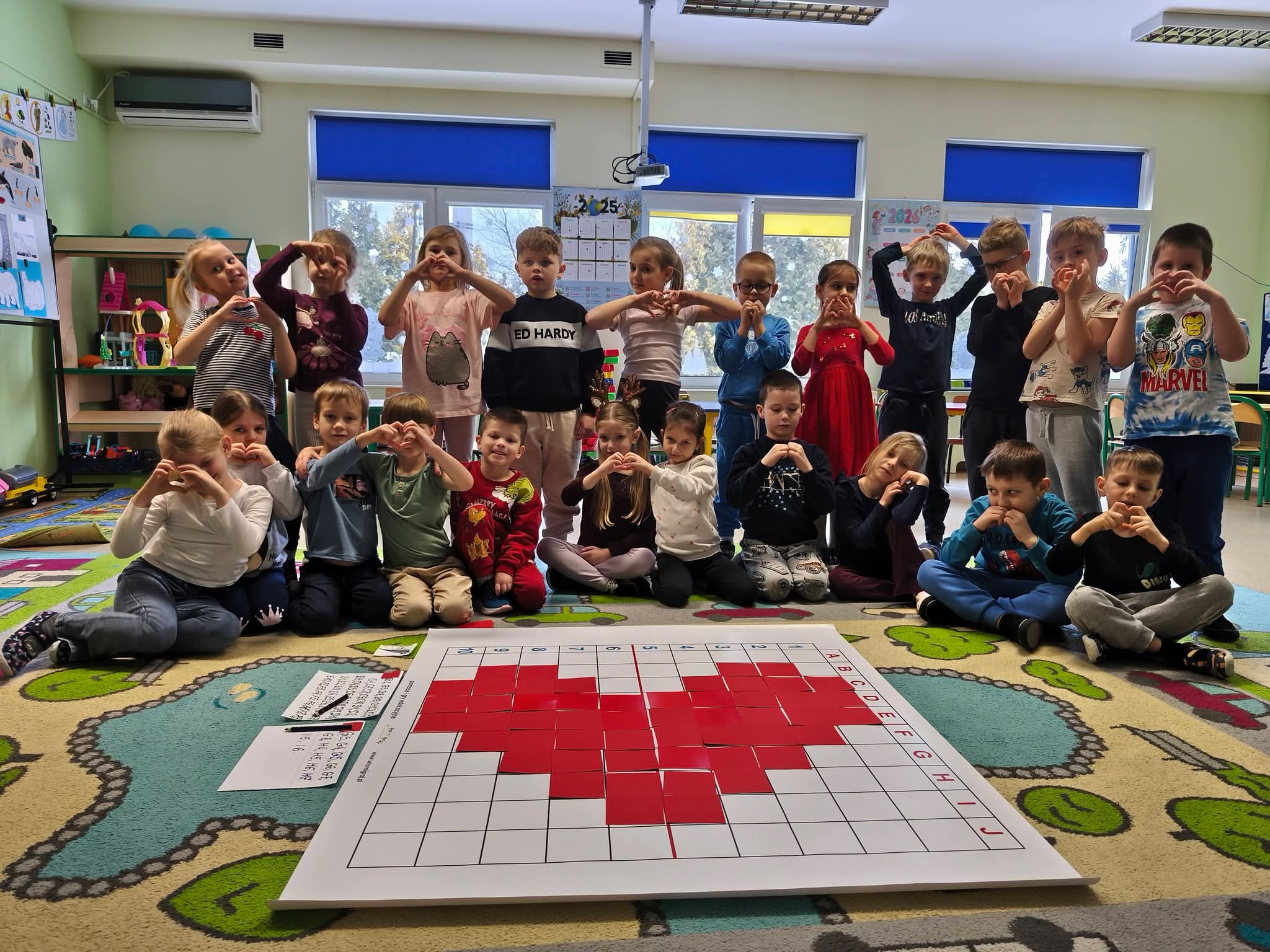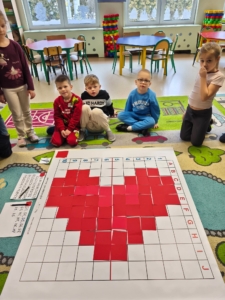 W grupie Gumisie odbyły się kolejne zajęcia z cyklu „Kodowanie na dywanie”. Celem tych zajęć było rozwijanie u dzieci umiejętności logicznego myślenia, koncentracji, orientacji na płaszczyźnie oraz współpracy w grupie poprzez odkodowanie obrazu „serca” na macie za pomocą przygotowanego kodu. Dzieci wykazały duże zaangażowanie i radość z efektu końcowego.