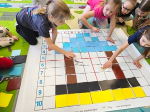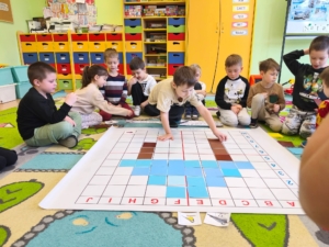 19.01 w grupie „Gumisiów” odbyły się kolejne zajęcia z cyklu „Kodowanie na dywanie”. Poprzez wspaniałą zabawę przedszkolaki doskonały dalsze kompetencje matematyczne w zakresie rozumienia i tworzenia informacji. W ramach tematu „Dbamy o zwierzęta zimą”, na macie powstawały kolejne odkodowane elementy związane z tematem. Następnie 6-latki szukały drogi ptaków do karmnika oraz zwierząt do paśnika. To było ciekawe i pouczające doświadczenie.