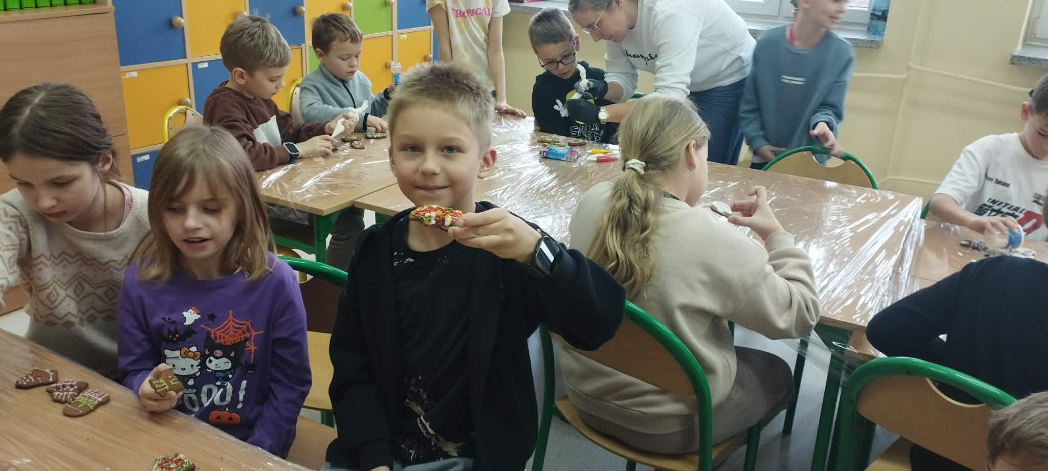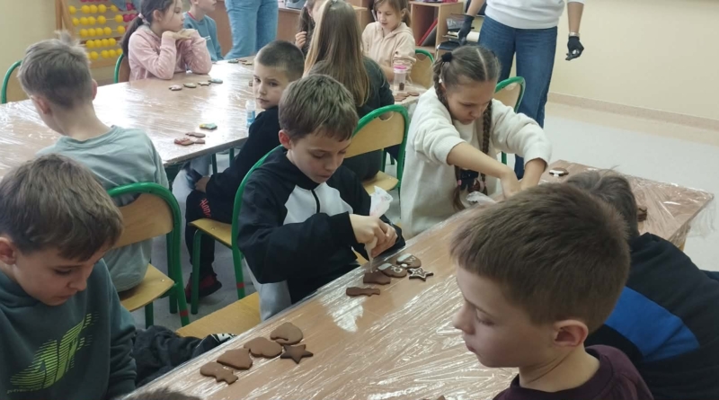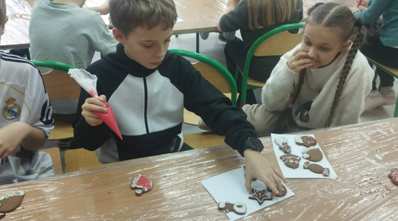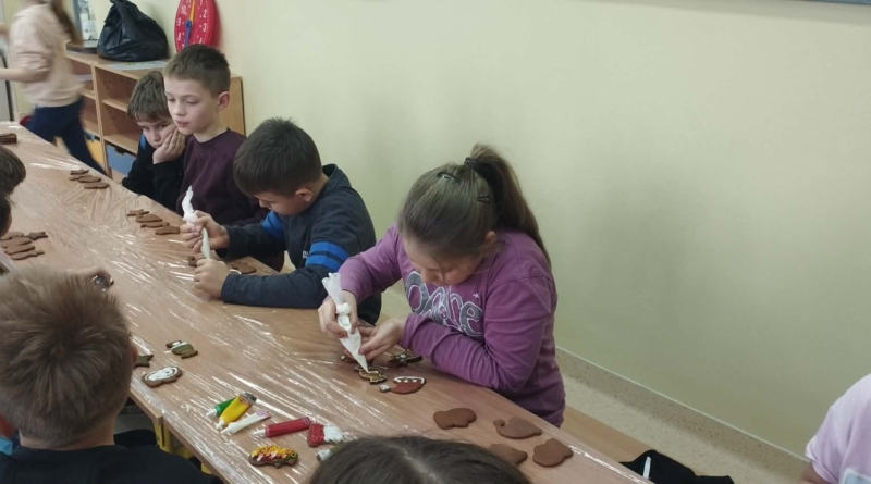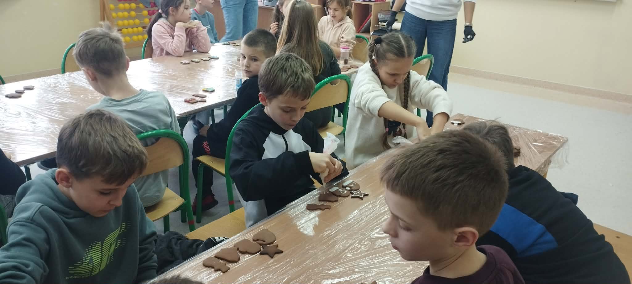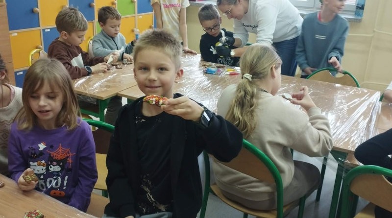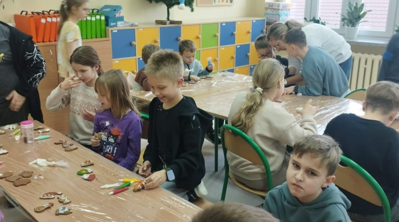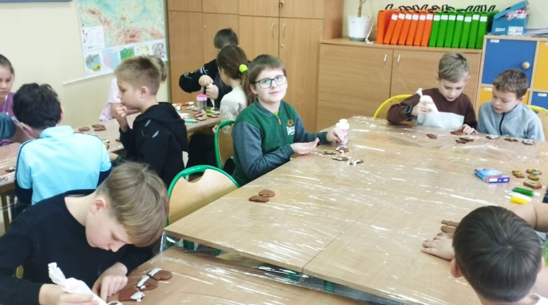 Podczas zajęć świetlicowych uczniowie klas 2a, 2b , 3 a oraz 4 a i 4b przenieśli się do prawdziwej, pachnącej korzennymi przyprawami świątecznej krainy pierniczków. Ten wyjątkowy dzień zamienił świetlicę w małą pracownię cukierniczą, w której od samego południa unosił się aromat cynamonu, goździków i dziecięcej radości. Warsztaty rozpoczęły się od wspólnego poznania tajemnicy idealnego piernikowego ciasta. Dzieci z entuzjazmem mieszały składniki według przepisu, ucząc się współpracy i cierpliwości. Gdy ciasto było gotowe, przyszła pora na wycinanie pierniczków – serduszek, gwiazdek, choinek i innych świątecznych kształtów, które już wtedy zapowiadały prawdziwe cukiernicze cuda. Nie mniejszym przeżyciem było przygotowanie lukru. Uczniowie samodzielnie wykonali go według poznanej receptury, a następnie z prawdziwym zapałem przystąpili do zdobienia. Kolorowe lukry, błyszczące posypki cukiernicze i nieograniczona wyobraźnia sprawiły, że każdy pierniczek stał się małym dziełem sztuki, jedynym w swoim rodzaju. Przez cały czas warsztatom towarzyszyła radosna, świąteczna atmosfera – pełna śmiechu, rozmów i wspólnego tworzenia. Ten dzień był nie tylko kulinarną przygodą, ale przede wszystkim piękną lekcją współpracy, kreatywności i przeżywania magii Świąt razem. ![]()