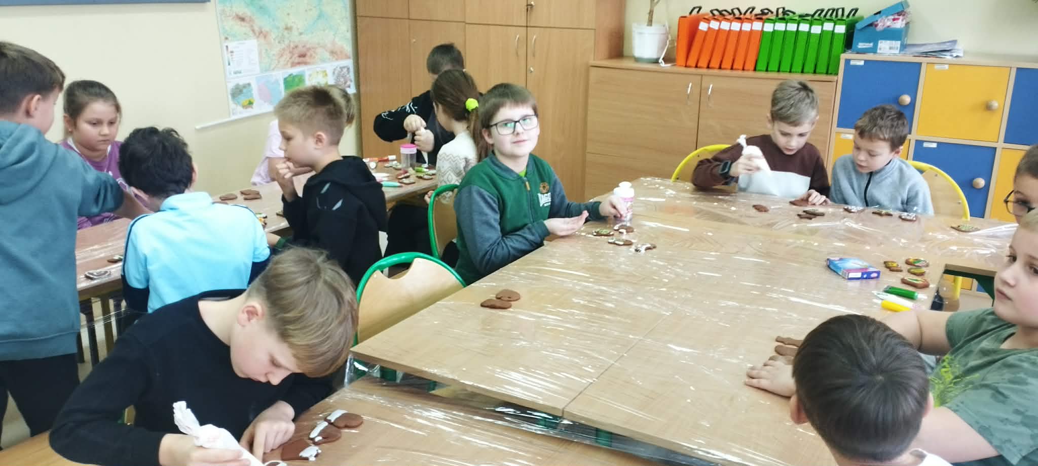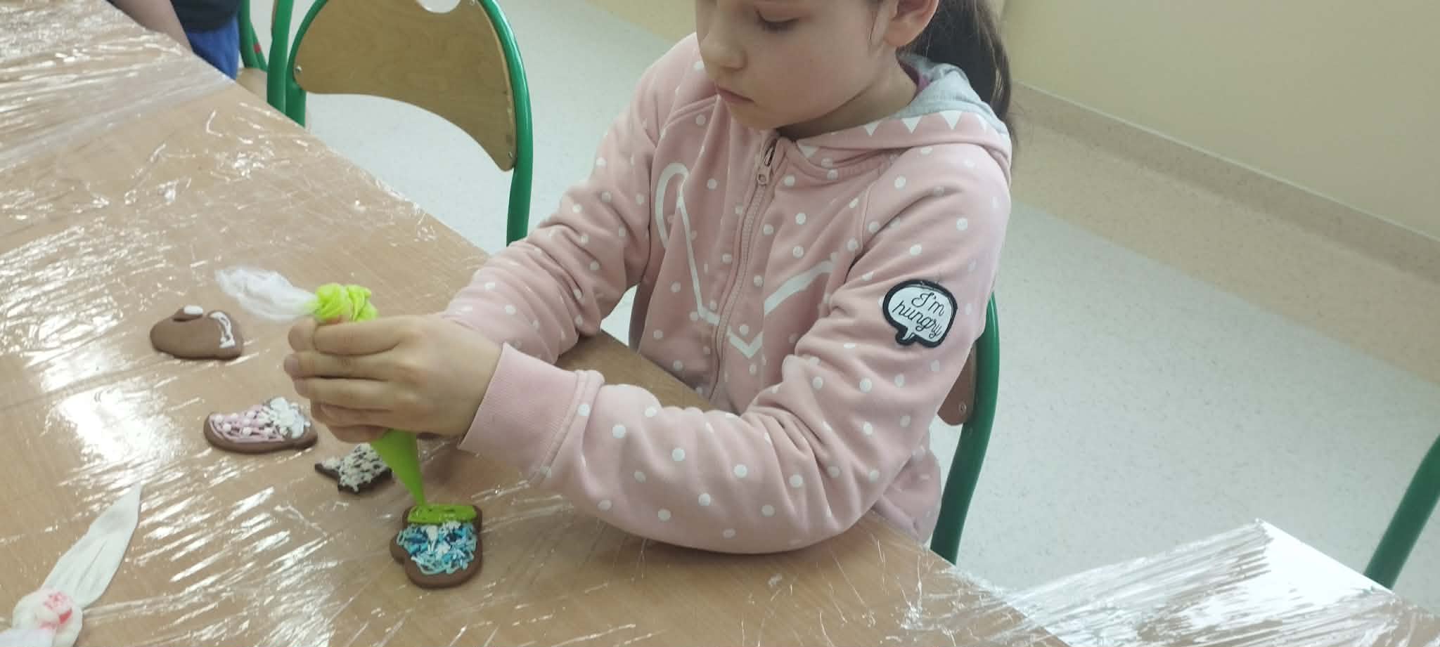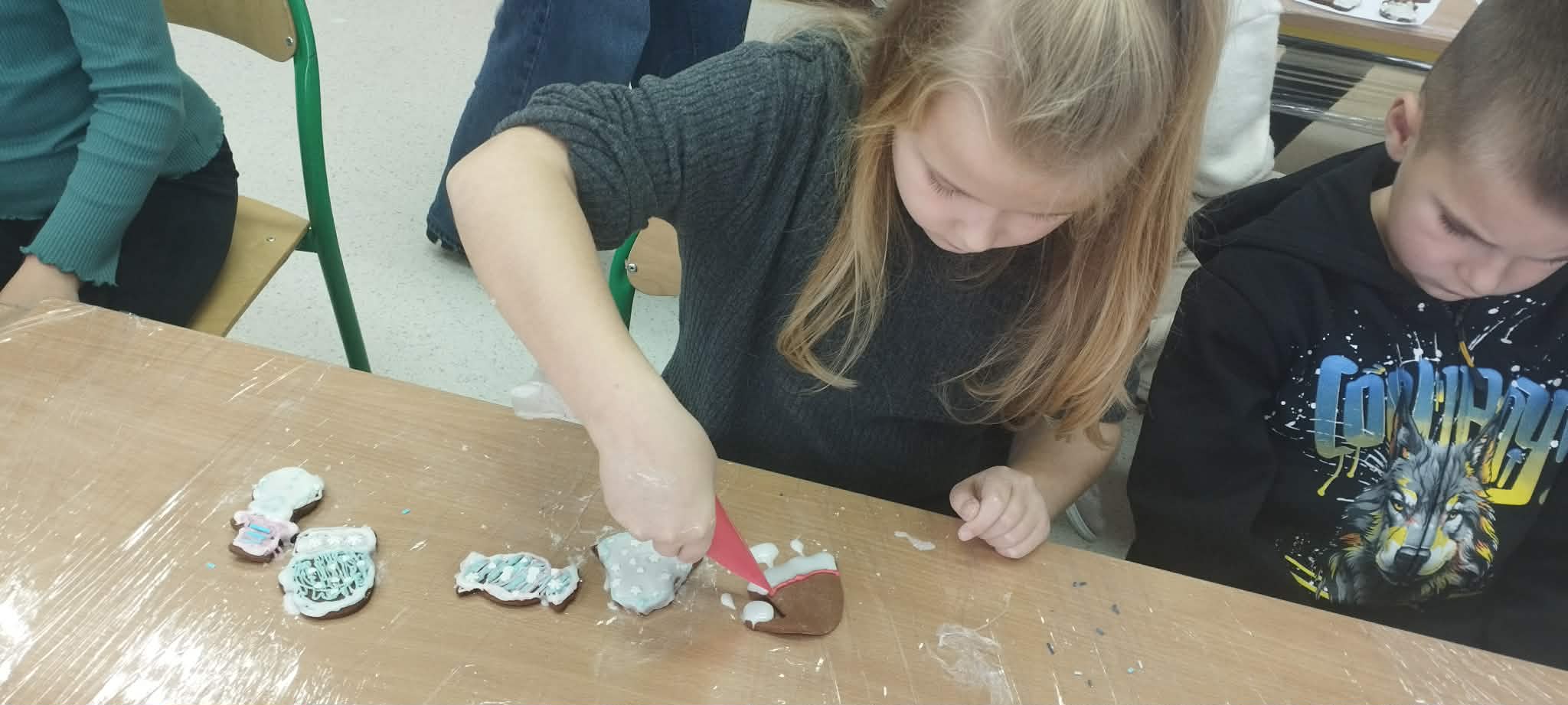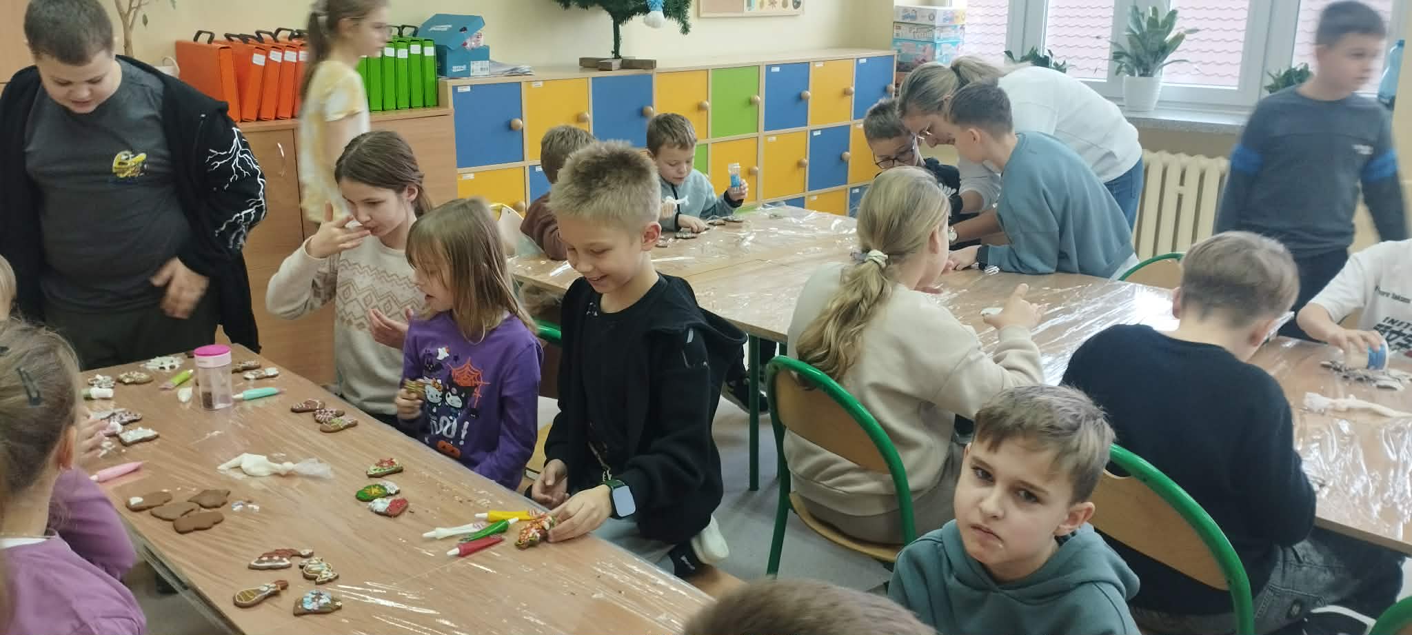 Podczas zajęć świetlicowych uczniowie klas 2a, 2b , 3 a oraz 4 a i 4b przenieśli się do prawdziwej, pachnącej korzennymi przyprawami świątecznej krainy pierniczków. Ten wyjątkowy dzień zamienił świetlicę w małą pracownię cukierniczą, w której od samego południa unosił się aromat cynamonu, goździków i dziecięcej radości. Warsztaty rozpoczęły się od wspólnego poznania tajemnicy idealnego piernikowego ciasta. Dzieci z entuzjazmem mieszały składniki według przepisu, ucząc się współpracy i cierpliwości. Gdy ciasto było gotowe, przyszła pora na wycinanie pierniczków – serduszek, gwiazdek, choinek i innych świątecznych kształtów, które już wtedy zapowiadały prawdziwe cukiernicze cuda. Nie mniejszym przeżyciem było przygotowanie lukru. Uczniowie samodzielnie wykonali go według poznanej receptury, a następnie z prawdziwym zapałem przystąpili do zdobienia. Kolorowe lukry, błyszczące posypki cukiernicze i nieograniczona wyobraźnia sprawiły, że każdy pierniczek stał się małym dziełem sztuki, jedynym w swoim rodzaju. Przez cały czas warsztatom towarzyszyła radosna, świąteczna atmosfera – pełna śmiechu, rozmów i wspólnego tworzenia. Ten dzień był nie tylko kulinarną przygodą, ale przede wszystkim piękną lekcją współpracy, kreatywności i przeżywania magii Świąt razem. ![]()