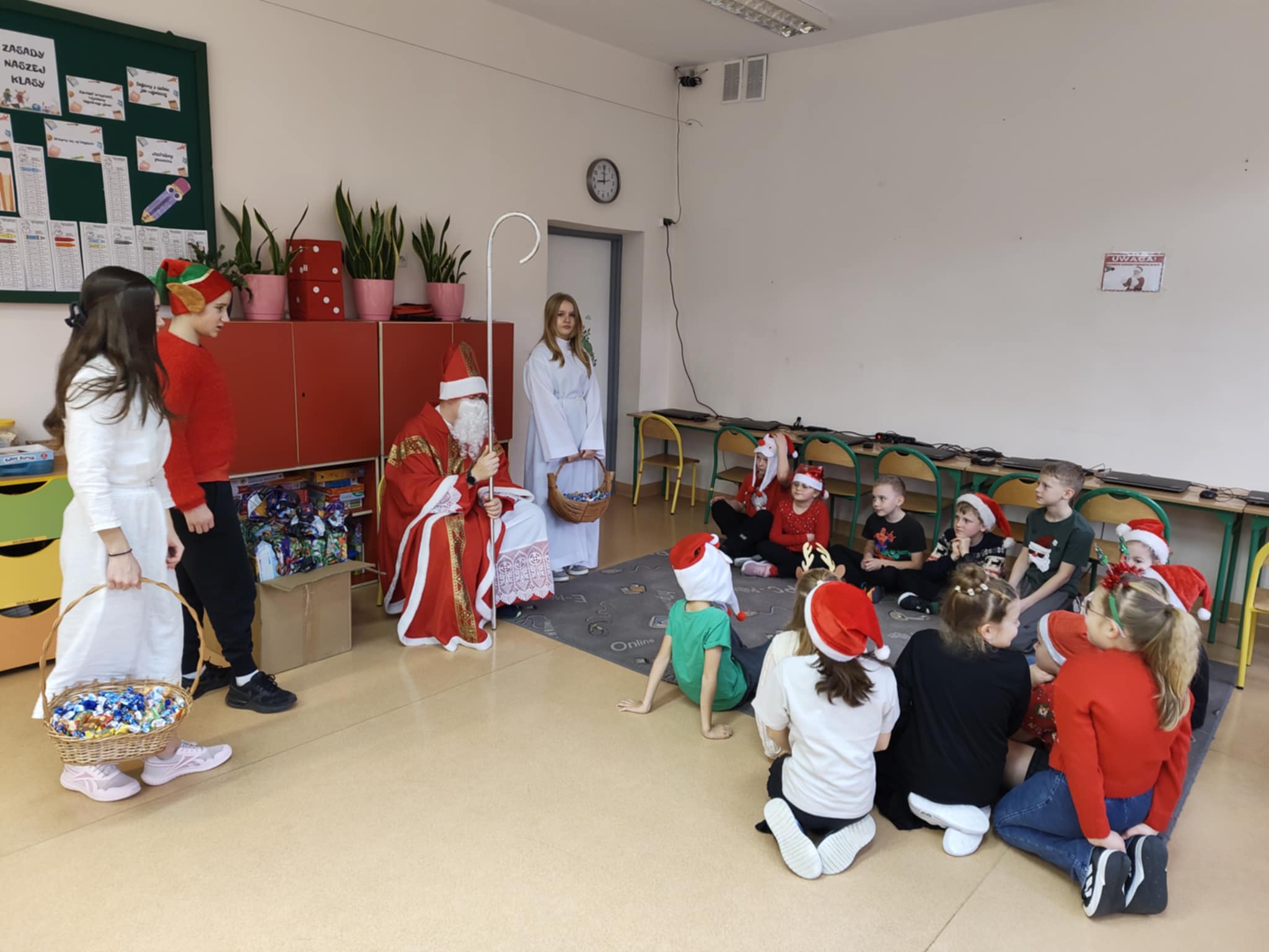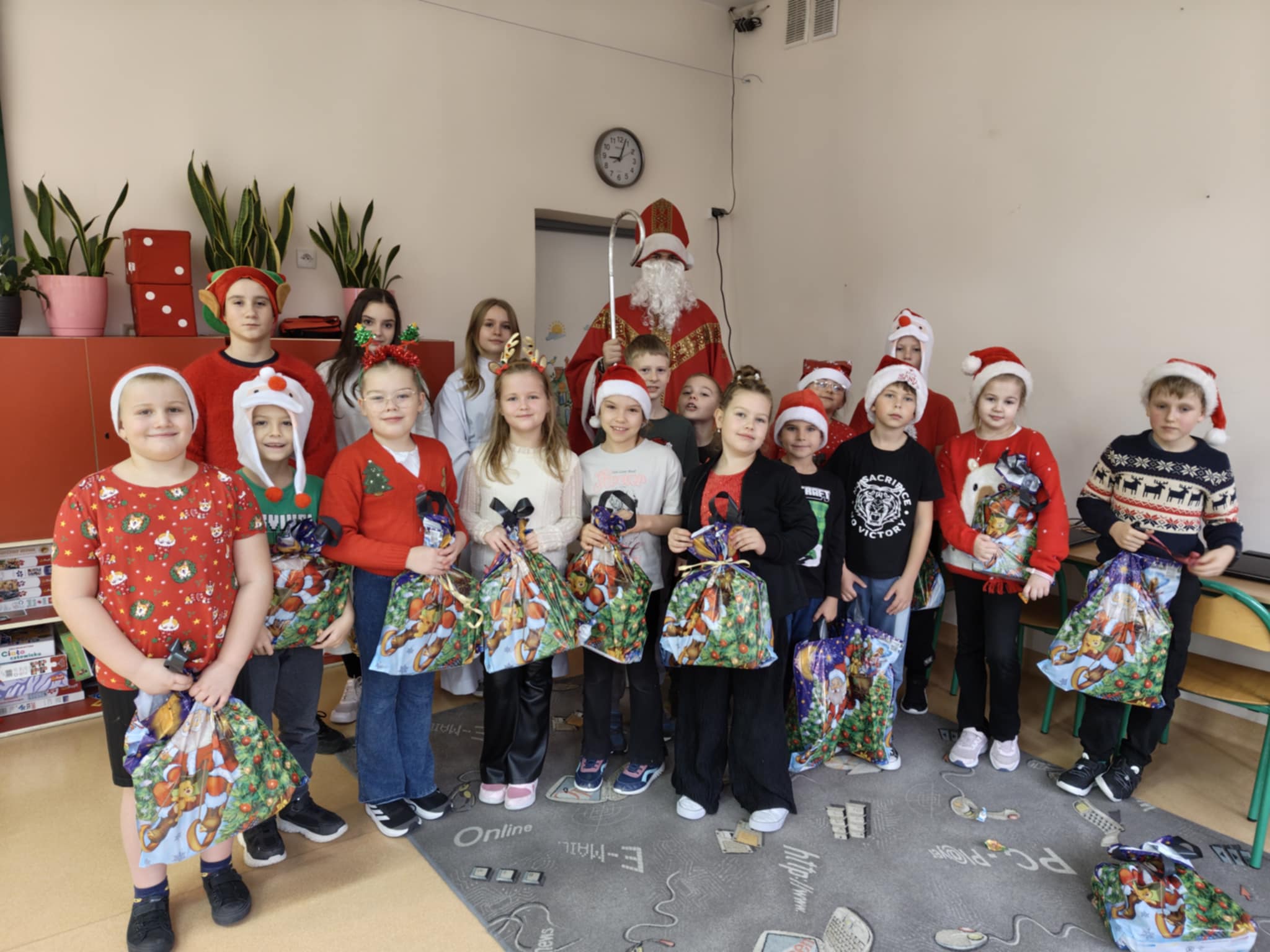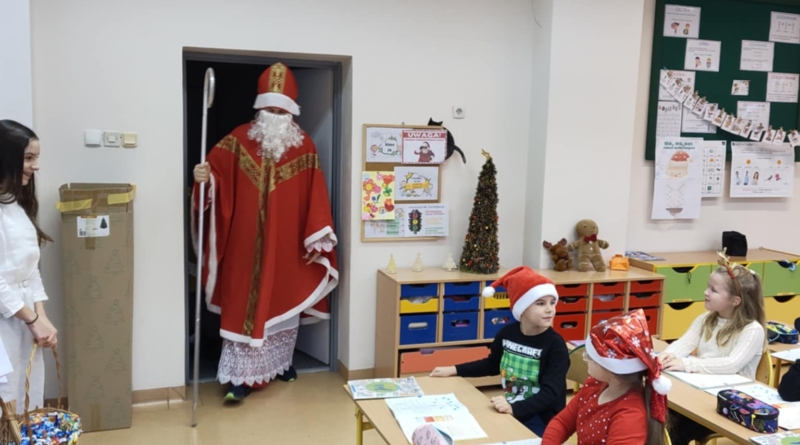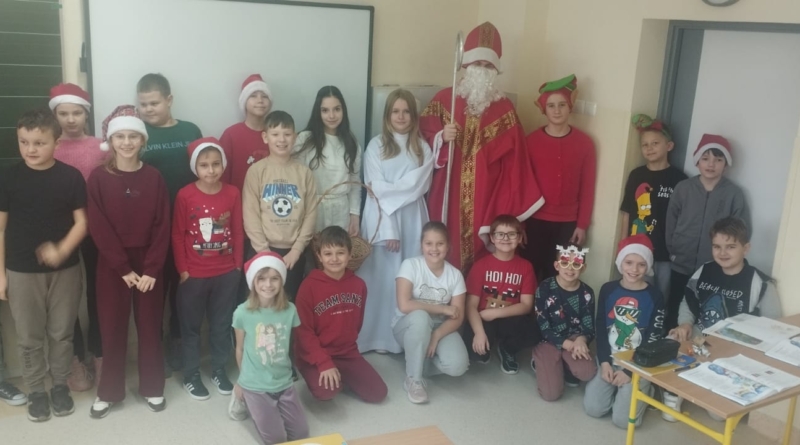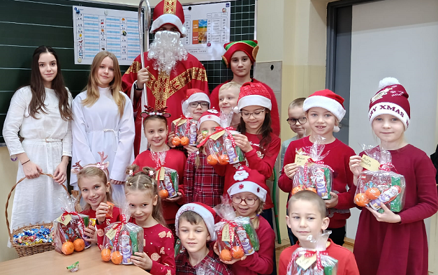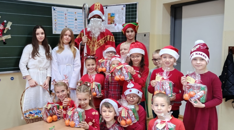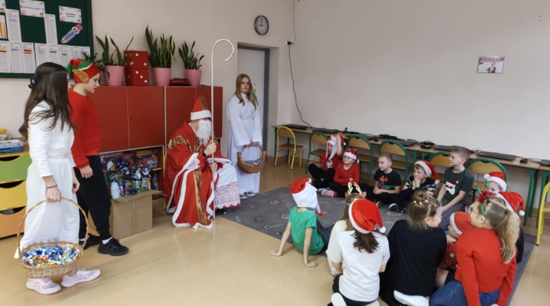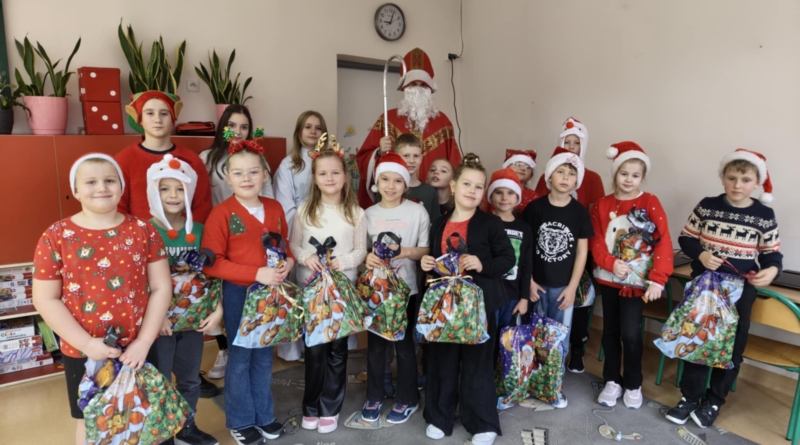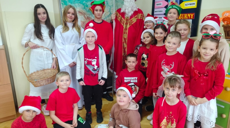 Dnia 5 grudnia naszą szkołę odwiedził Święty Mikołaj. Uczniowie z radością powitali go w swoich klasach, a Mikołaj obdarował dzieci drobnymi upominkami i słodyczami. Spotkaniu towarzyszyły świąteczne piosenki, wspólne zdjęcia oraz dużo uśmiechu. Wizyta Mikołaja wprowadziła wszystkich w wyjątkowy, świąteczny nastrój i była miłym początkiem grudniowych przygotowań.
