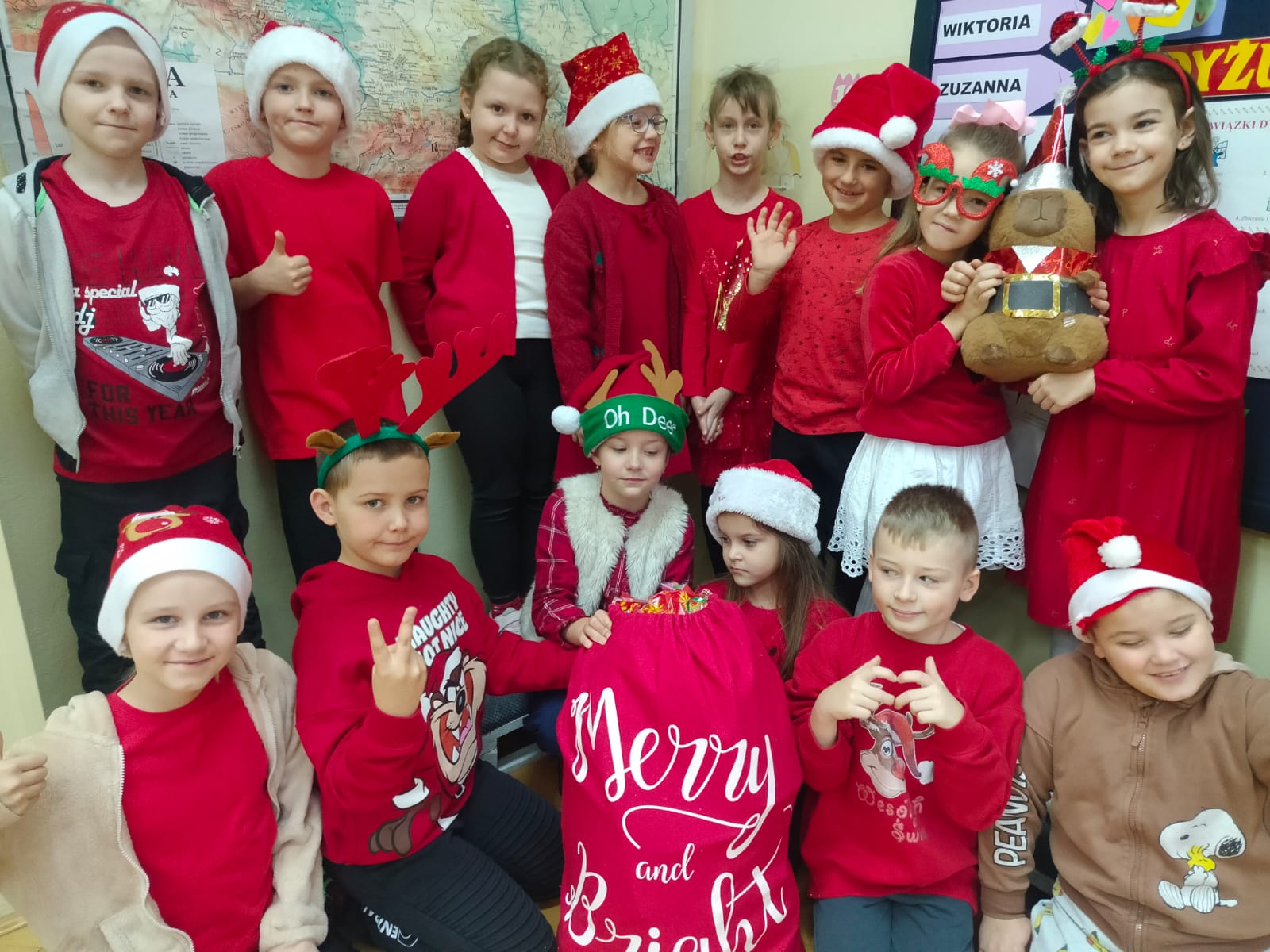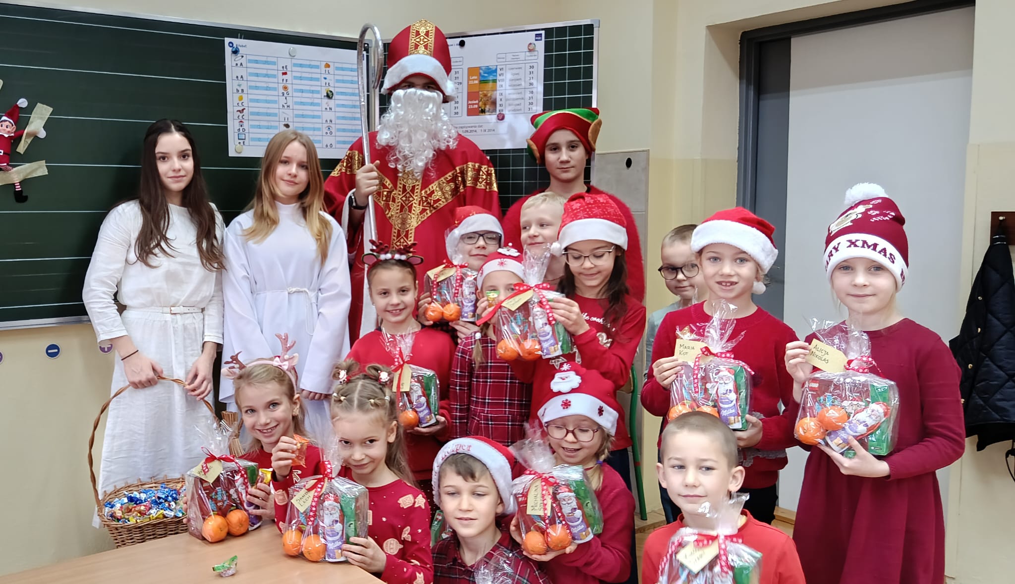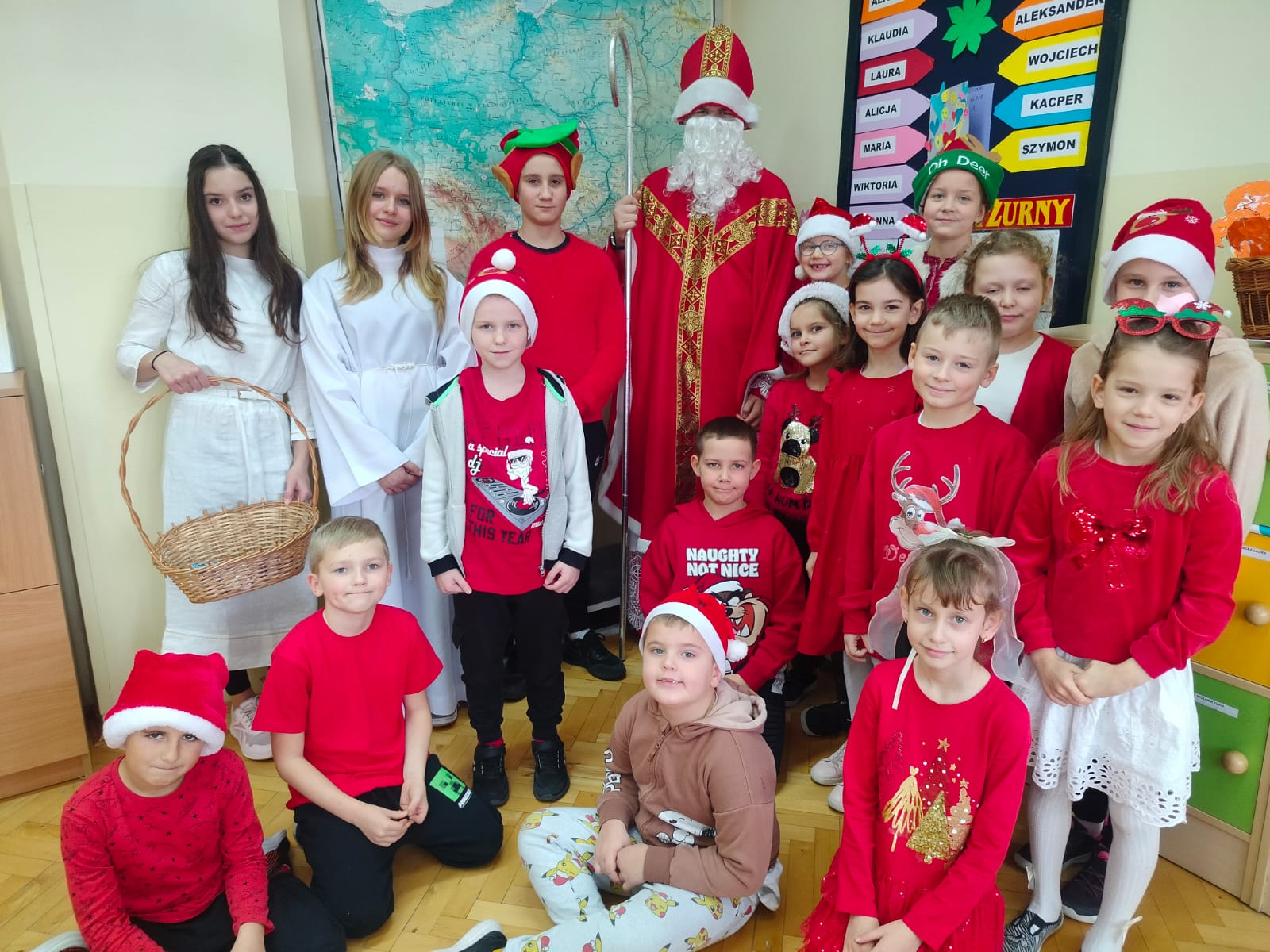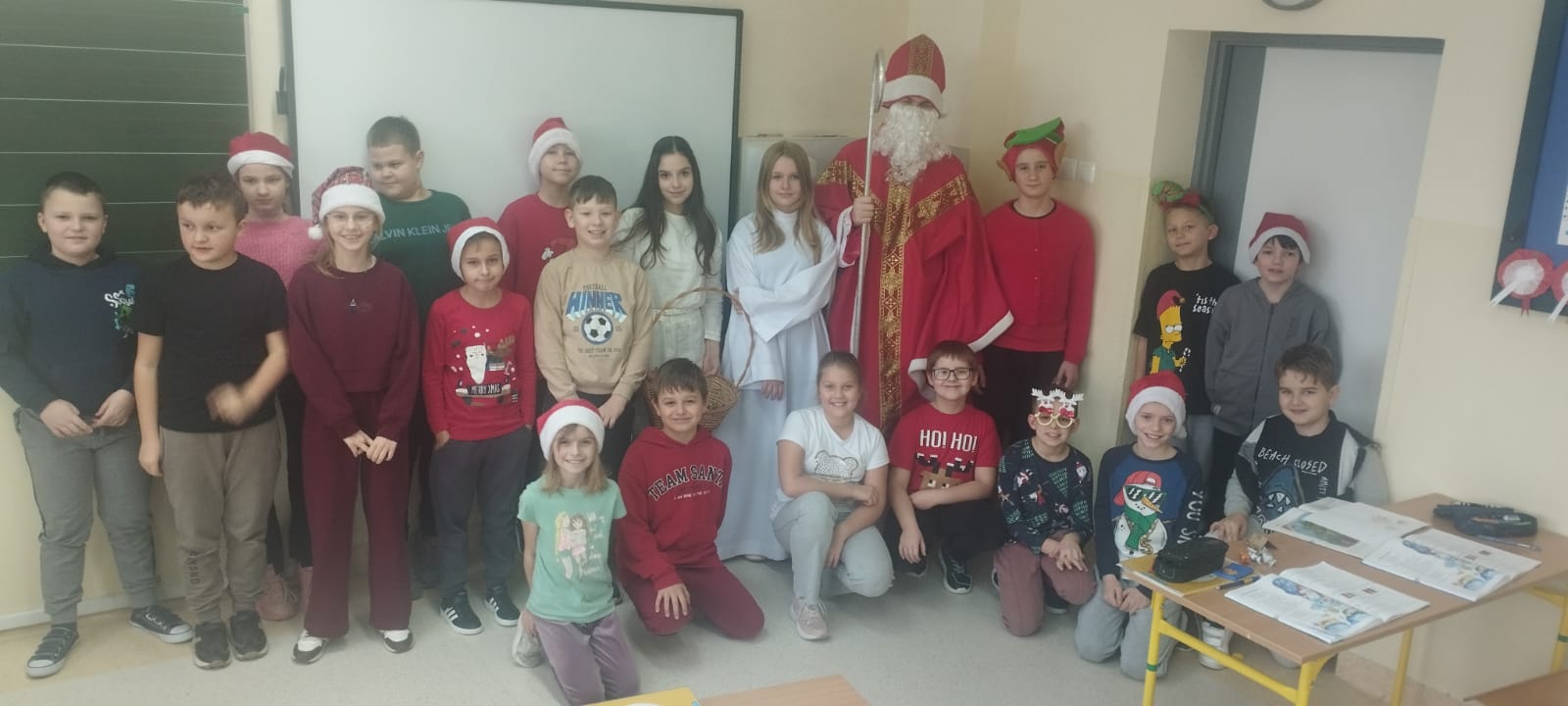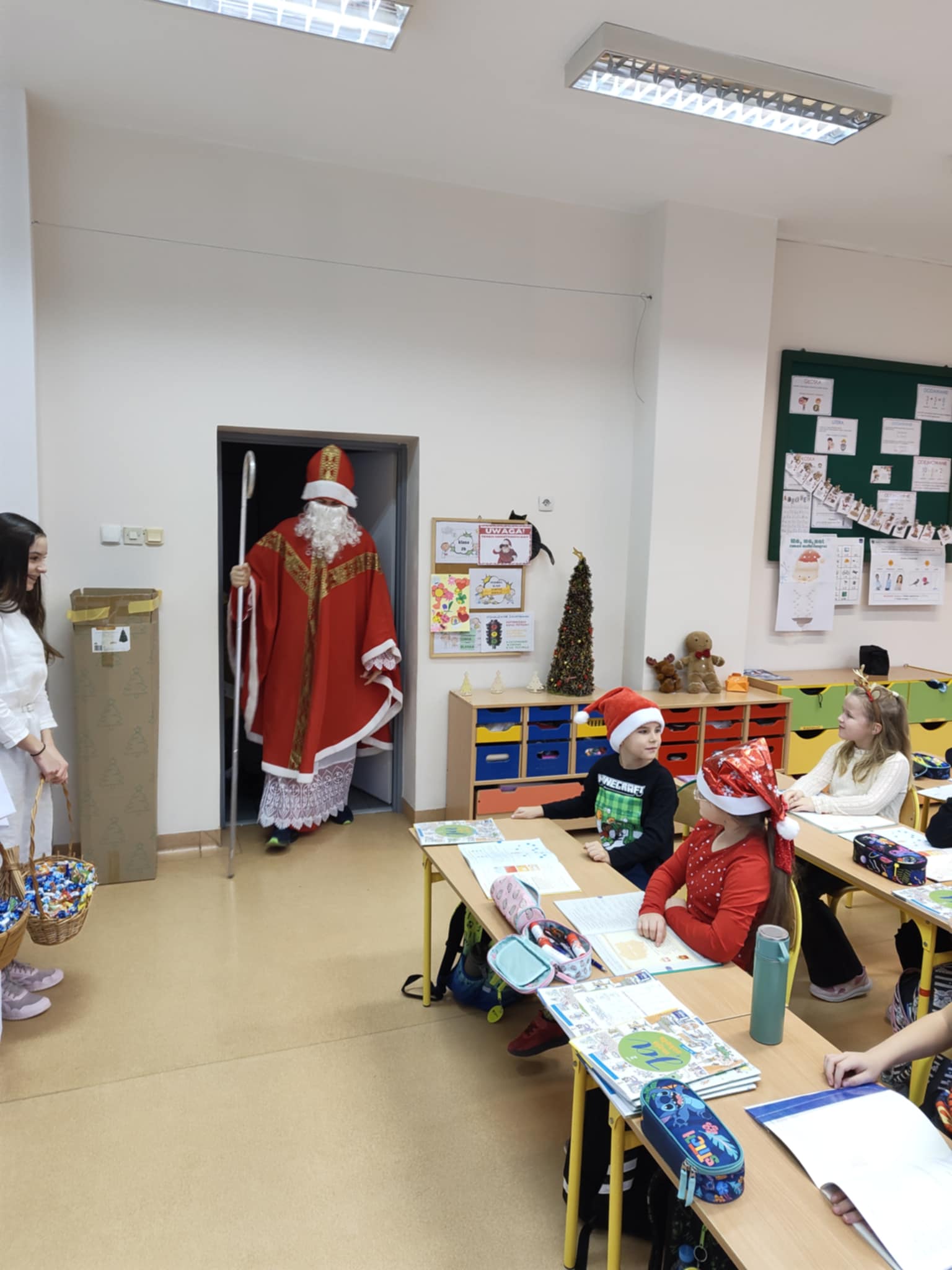 Dnia 5 grudnia naszą szkołę odwiedził Święty Mikołaj. Uczniowie z radością powitali go w swoich klasach, a Mikołaj obdarował dzieci drobnymi upominkami i słodyczami. Spotkaniu towarzyszyły świąteczne piosenki, wspólne zdjęcia oraz dużo uśmiechu. Wizyta Mikołaja wprowadziła wszystkich w wyjątkowy, świąteczny nastrój i była miłym początkiem grudniowych przygotowań.