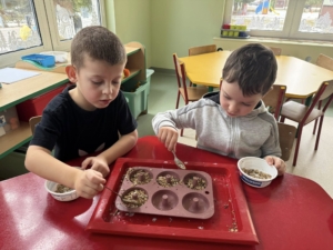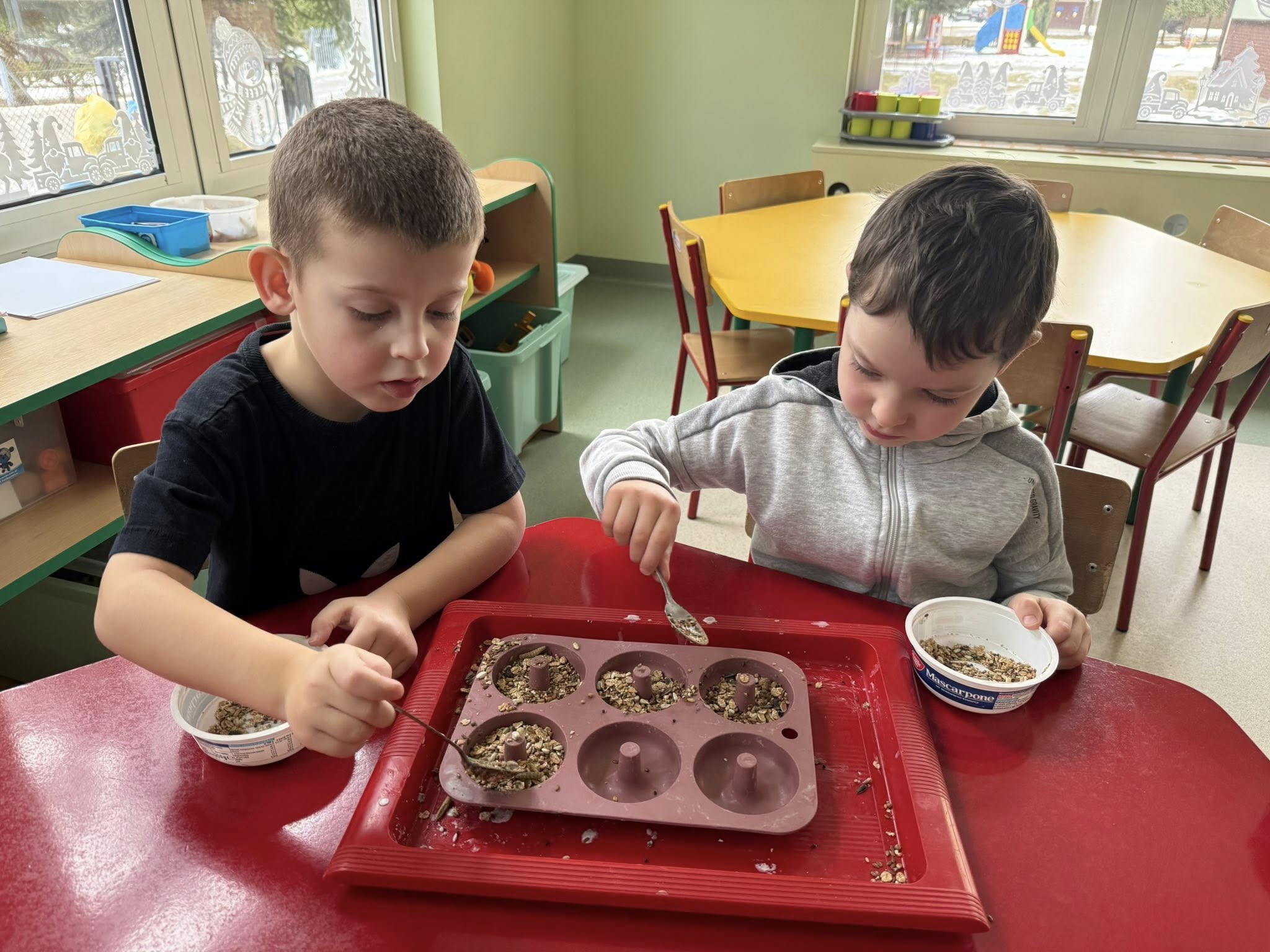 W bieżącym tygodniu nasze „Biedronki” z ogromnym zaangażowaniem przygotowywały przysmaki dla ptaszków. Dzieci wsypywały ziarenka, starannie komponowały mieszanki i z wielką troską rozmawiały o tym, dlaczego zimową porą tak ważne jest dokarmianie naszych skrzydlatych przyjaciół. To była nie tylko wspaniała zabawa, ale także cenna lekcja wrażliwości, odpowiedzialności i troski o przyrodę.