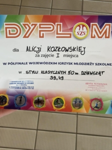 W zawodach udział wzięła uczennica klasy 8 – Alicja Kozłowska. Ala trenuje pływanie od wielu lat, sport ten jest jej ogromną pasją. Nasza zawodniczka zaprezentowała się znakomicie, zdobywając I miejsce w swojej kategorii wiekowej na dystansie 50 m stylem klasycznym. Był to piękny występ, który potwierdził jej wysoki poziom i doskonałe przygotowanie.