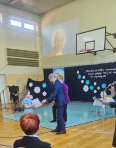 Dla laureatów oraz osób wyróżnionych przewidziano nagrody i dyplomy, których wręczenie nastąpiło podczas uroczystej akademii poświęconej Osobie Jana Pawła II w dniu 3 kwietnia 2025 r. w Zespole Szkół w Łące.