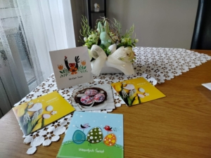 Z okazji zbliżających się Świąt Zmartwychwstania Pańskiego Szkolne Koło Wolontariatu zorganizowało, jak co roku akcję- „Kartka Wielkanocna”. Realizując główny cel jakim jest niesienie pomocy i radości innym oraz budowanie wspólnoty i więzi międzypokoleniowej, wolontariusze z naszej szkoły z pomocą nauczycieli wykonali symboliczne kartki oraz świąteczne babeczki. Trafiły one m.in. do emerytowanych nauczycieli i pracowników naszej szkoły, osób chorych i samotnych z naszej miejscowości.