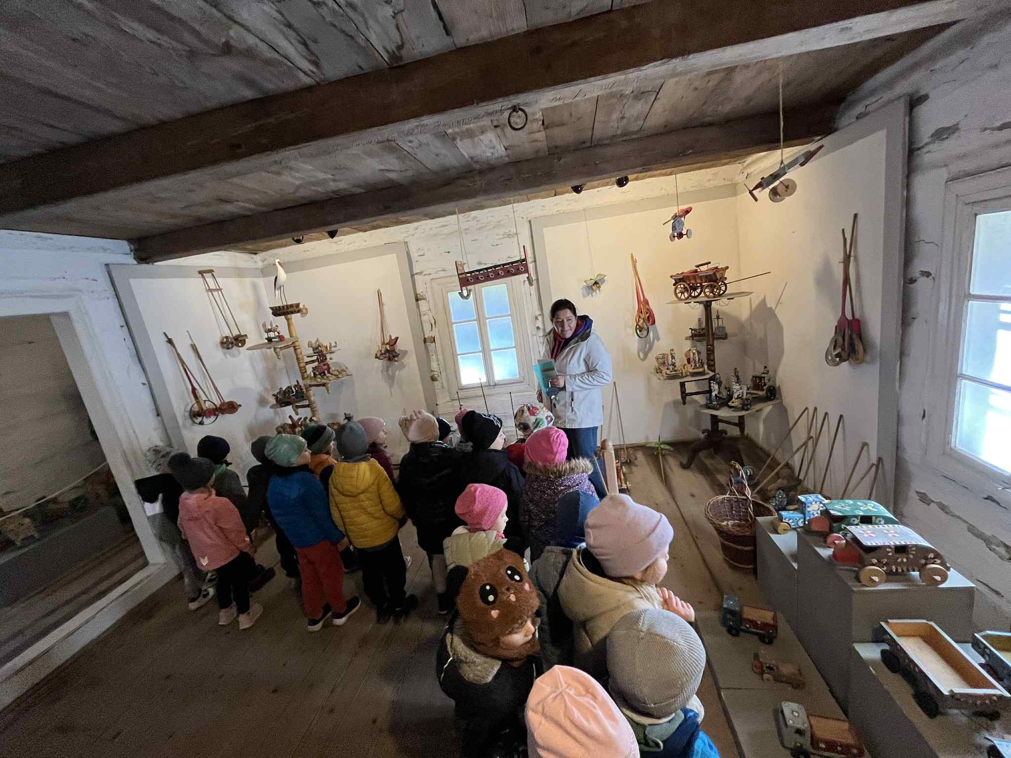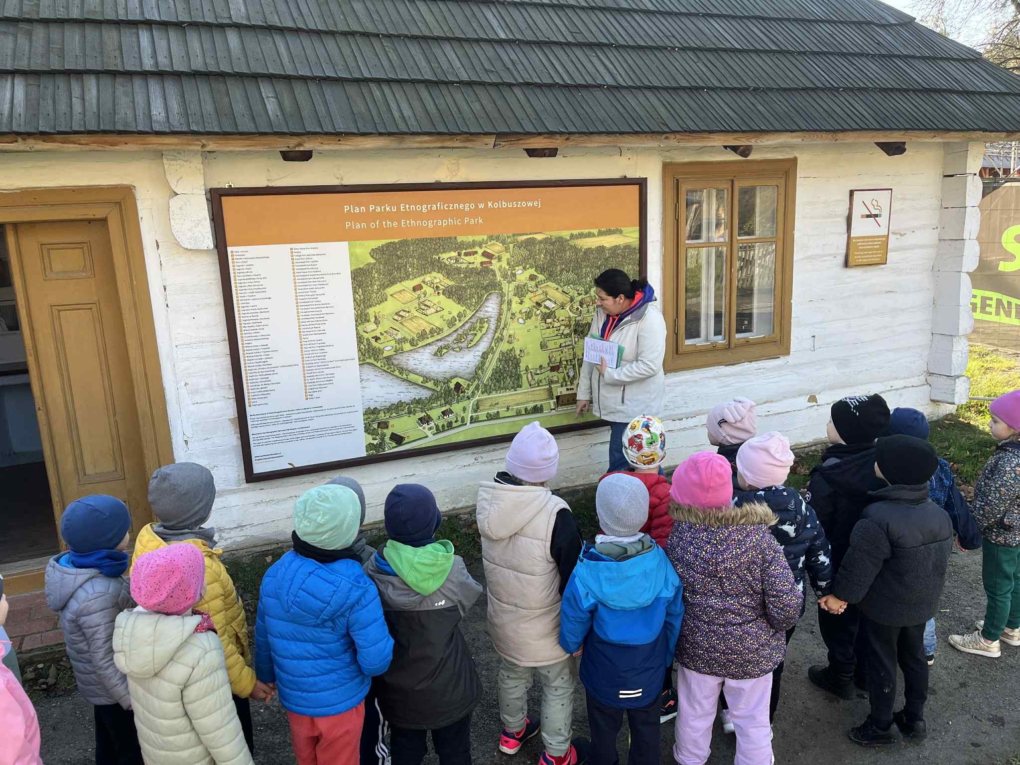 W dniu 29.10.2025 „Słoneczka” wybrały się na wycieczkę do Skansenu w Kolbuszowej. Podczas spaceru z Panią Przewodnik dzieciaki miały okazję zobaczyć jak dawniej wyglądały domy i dowiedzieć się jak żyło się w takiej „chałupie” bez prądu, kanalizacji i innych „luksusów”. Przedszkolaki dowiedziały się skąd pochodzi nazwa Lasowiacy i jakie dary ofiarował im las. Podczas wycieczki udało się także zaobserwować owce, samotnego kaczora, gęsi, kury i króliki.