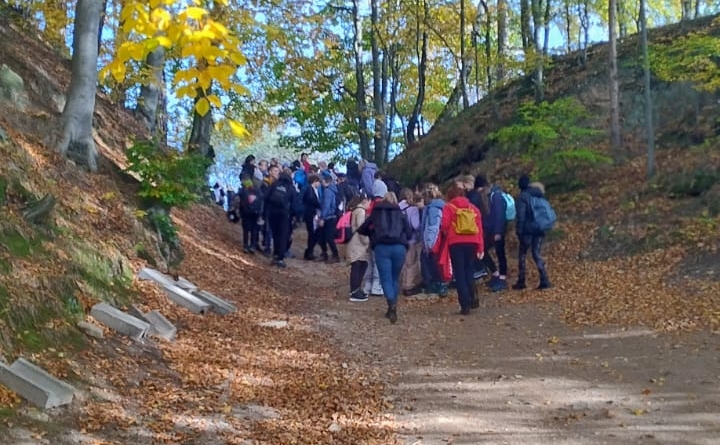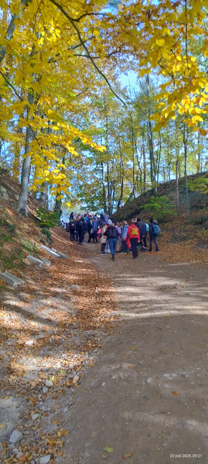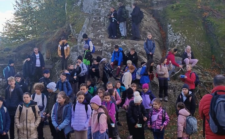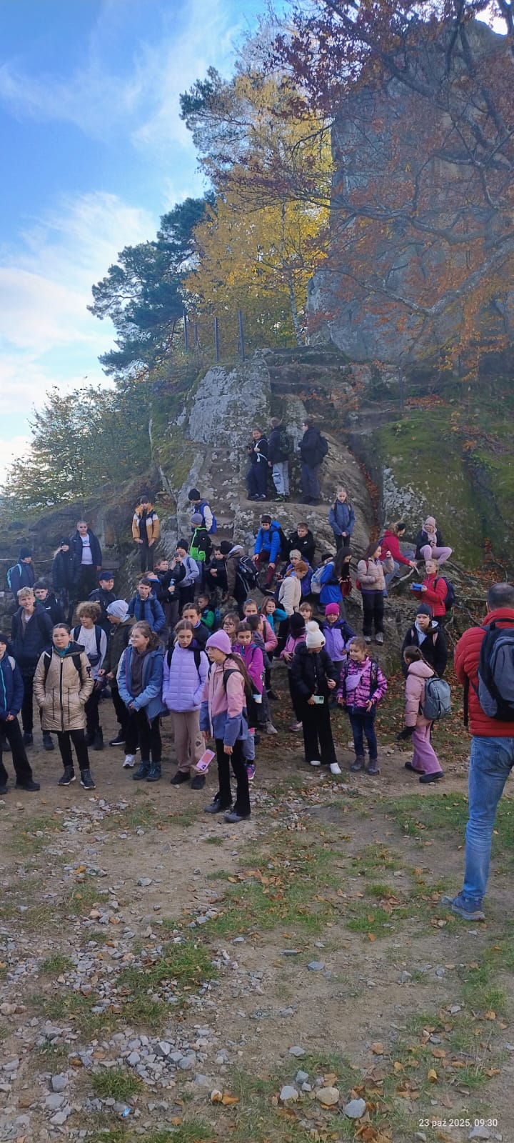 Kolejnym etapem wyprawy był Rezerwat Przyrody „Prządki”, znany z niezwykłych form skalnych o fantazyjnych kształtach. Uczniowie wysłuchali legendy o trzech pannach zamienionych w kamienie oraz podziwiali jesienne krajobrazy Pogórza Strzyżowskiego.