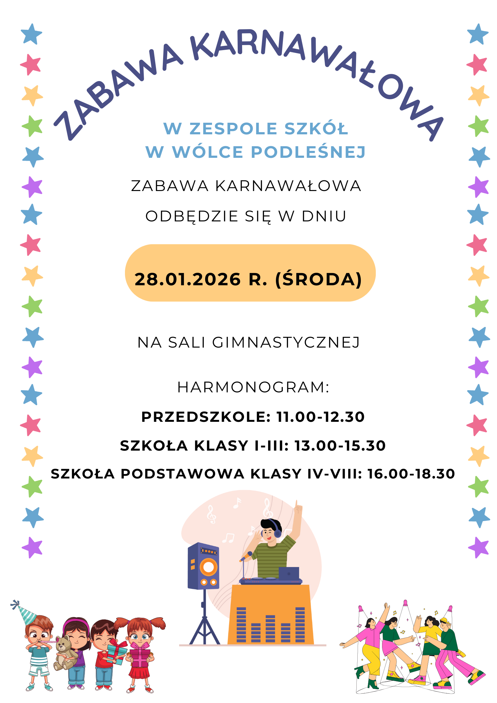 Zabawa karnawałowa w Zespole Szkół w Wólce Podleśnej odbędzie się w dniu 28.01.2026 r. (środa) na Sali Gimnastycznej.